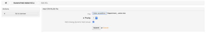 Then upload the Excel file, the priority (order) of the list can be configured. Other lists with dependencies of this list can be preceded or followed. By combining several fields, a multi-level dependency is possible. With the option "Add missing dynamic field values" not yet existing values of the dynamic field are created automatically.