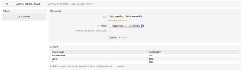 This add-on provides the feature to maintain dependencies between dynamic fields in an Excel or CSV file. Where previously had to be worked with countless ACLs now the data maintenance in a table is all you need. Especially in use cases where many possible values are stored in the dynamic fields or the values change regularly, this add-on can make your job easier.